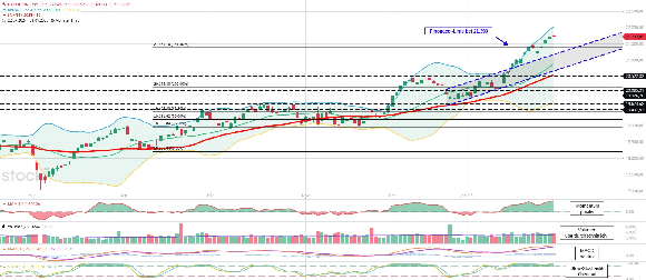 Markttechnische Indikatoren paradoxerweise ohne akutes Verkaufssignal: Der Trendfolgeindikator MACD zeigt sich weiter neutral. Der zweite Trendfolger, der Ichimoku-Indikator, steht weiterhin für eine übergeordnete langfristige Trendfestigkeit und bei etwaigen Kursrückgängen schlimmstenfalls für eine kurzfristige Konsolidierung. Die Slow-Stochastik zeigt sich nach wie vor überkauft, wirft aber auch am heutigen Montag abermals kein akutes Verkaufssignal ab. Das Momentum präsentiert sich auch heute wieder positiv. Die Markttechnik steht damit wie gehabt für eine weiterhin mittel- bis langfristig intakte übergeordnete Aufwärtstendenz. Allerdings könnte sich nun durchaus eine kurzfristige Konsolidierung abzeichnen.