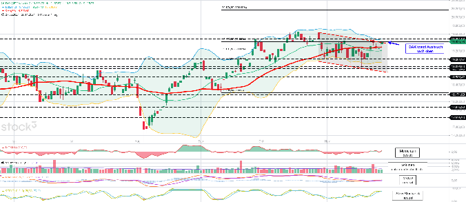 DAX vor Ausbruch?: Der deutsche Leitindex konnte im bisherigen Wochenverlauf seine technische Stabilisierung festigen. Die nächste charttechnische und markttechnische Unterstützung liegt nun schon bei 19.192 Indexzählern und konnte mittels einer „Morning-Star“-Formation spürbar gehalten werden. Gleichzeitig konnten auch sowohl die 38-Tage-Linie als auch das Mittlere Bollinger-Band erfolgreich überhandelt werden. Der DAX konnte in diesem Zuge – wenn auch minimal – seinen kurzfristigen, seit 29.10.2024 intakten Abwärtsmodus verlassen. Es sieht alles danach aus, dass er nun wieder die 19.491 anlaufen könnte. Ein Überschreiten könnte zudem eine dann doch noch etwaige Jahresendrally einläuten. Allerdings lauert bei 19.496 Punkten schon das Obere Bollinger-Band. Es sieht allerdings danach aus, dass sich dieses nun nach oben öffnen könnte.