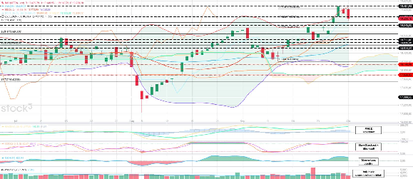 DAX bleibt weiterhin deutlich über 19.000: Der Trendfolgeindikator MACD zeigt sich weiterhin überkauft. Der zweite Trendfolger, der Ichimoku-Indikator ist auch am heutigen Mittwoch positiv. Die Slow-Stochastik ist weiterhin überkauft. Heute könnte ein zusätzliches Signal kommen. Das Momentum scheint auch am Hochpunkt angekommen zu sein. Es bleibt aber konstant positiv.. Die Bollinger-Bänder zeigen immer noch einen großen Abstand. Das Obere Bollinger-Band (19.468) bleibt unterschritten. Das Untere Bollinger-Band tendiert bei 18.084 Zähler. Die Markttechnik steht für eine übergeordnete Aufwärtstendenz, allerdings auch für eine anhaltende Konsolidierung auf relativ hohem Niveau. Die jüngste Euphorie hat sich gelegt, Panikmodus sollte nun aber keiner aufkommen.