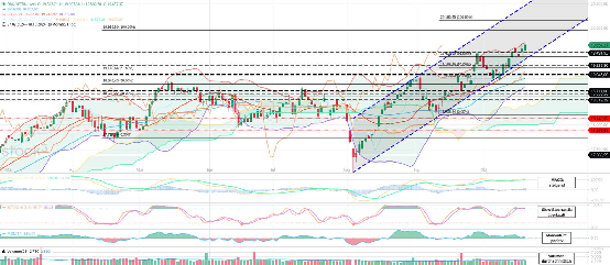 Aufwärtstrend auch zum Wochenstart: Der deutsche Leitindex befindet sich auch zu Beginn der neuen Handelswoche im übergeordneten chart- und markttechnischen Aufwärtstrend. Die Aufmerksamkeit gilt dabei, wie schon in den letzten Tagen, dem Oberen Bollinger-Band bei nun 19.703 Indexpunkten. Die untere Trendlinie des kurzfristigen Aufwärtsmodus verläuft nun bei rund 19.440 Zählern. Darunter stützt noch eine charttechnische Linie bei 19.240. Somit ist auch zu Beginn der Woche für etwaige Gewinnmitnahmen genug Spielraum nach unten, ohne den vorherrschenden Trend gravierend zu verlassen. Auch heute deutet weiterhin vieles auf den eingeläuteten Beginn einer Jahresendrally hin. Diese hätte weiterhin die Fibonacci-Projektion bei 20.164 Punkten zum mittelfristigen Ziel.