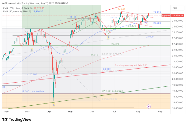 Am Freitag entstand beim DAX überdies eine hochinteressante Entwicklung, gleich zu Beginn des Handels stürmte der Index über die Barriere von 24.500 Punkten, fiel intraday aber wieder auf den Donnerstagsschlussstand um 24.360 Punkten zurück, wodurch aus technischer Sicht ein latenter Fehlausbruch vorliegt. In den vorherigen Abwärtstrend, bestehend seit dem Rekordhoch vom 10. Juli ist der Index aber nicht zurückgefallen, wodurch immer noch die Annahme einer bullischen Flagge im Raum steht, die übergeordnet trendbestätigend wirkt und weiterhin Anstiegschancen auf 24.639, 24.730 und in der Spitze 24.961 Punkte birgt. Für ein solches Szenario wird aber nachhaltiger Ausbruch über 24.500 Punkte vorausgesetzt! Insgesamt bleiben bis zu einer anderen Signallage die Kursmuster als bullisch zu bewerten. Ein Rückzug des Barometers unter 23.968 Punkte würde aber eine deutliche Eintrübung hervorrufen, rasche Abschläge in den Bereich des 50-Tage-Durchschnitts bei 23.924 Punkten und darunter 23.500 Punkte blieben aller Wahrscheinlichkeit nach dann nicht aus.