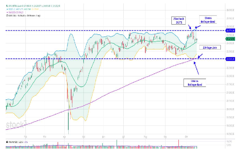 - Oberes Bollinger-Band: 24.816, Mittleres Bollinger-Band: 24.078, Unteres Bollinger-Band: 23.339