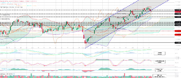 Markttechnik uneinheitlich: Der Trendfolgeindikator MACD fällt nach seinem Verkaufssignal nun weiter ab. Damit bestätigt er den Rutsch aus dem kurzfristigen Aufwärtstrend. Der zweite Trendfolger, der Ichimoku-Indikator ist dagegen nach wie vor trendfolgend positiv (Mittel- und Langfristtrend). Die Slow-Stochastik fällt ebenfalls ab. Sie ist seit gestern nun nicht mehr überkauft. Das Momentum bleibt zwar positiv, aber weiterhin nur leicht über der Nulllinie. Das Untere und Mittlere Bollinger-Band steigen weiterhin gleichmäßig nach oben an. Das Obere Bollinger-Band (19.686) flacht sich allerdings leicht ab. Die Markttechnik steht damit zum einen insgesamt für eine weiterhin mittel- bis langfristig intakte übergeordnete Aufwärtstendenz, gleichzeitig aber auch für eine anhaltende kurzfristige Konsolidierung auf sehr hohem Niveau.