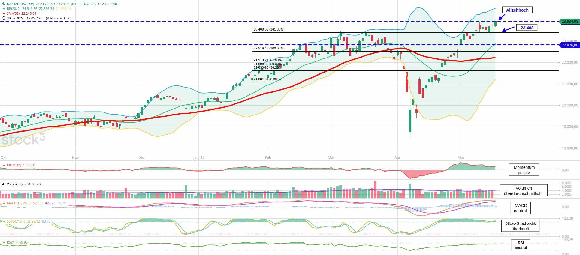 Markttechnik bleibt freundlich: Der Trendfolgeindikator MACD zeigt sich am heutigen Dienstag weiterhin in beiden Lesarten neutral und trendbestätigend. Der zweite Trendfolger, der Ichimoku-Indikator, ist nach wie vor positiv. Das Momentum ebenso. Die chart- und markttechnischen Signale und Vorzeichen der letzten Wochen haben sich mehr als eindrucksvoll bewahrheitet und fortgesetzt. Die Slow-Stochastik zeigt sich auch heute wieder überkauft. Ein akutes Verkaufssignal wirft sie trotzdem immer noch nicht ab. Das Obere Bollinger-Band (24.547) dreht weiter nach oben und tendiert nach wie vor deutlich oberhalb dem gestrigen Allzeithoch (23.935). Das kurzfristige Risiko ist nun bis 23.408 Punkte begrenzt. Die Chance lässt sich dank der Markttechnik sogar noch weiter über das bisherige Allzeithoch beziffern. Dafür sprechen weiterhin alle drei nach oben drehenden Bollinger-Bänder.