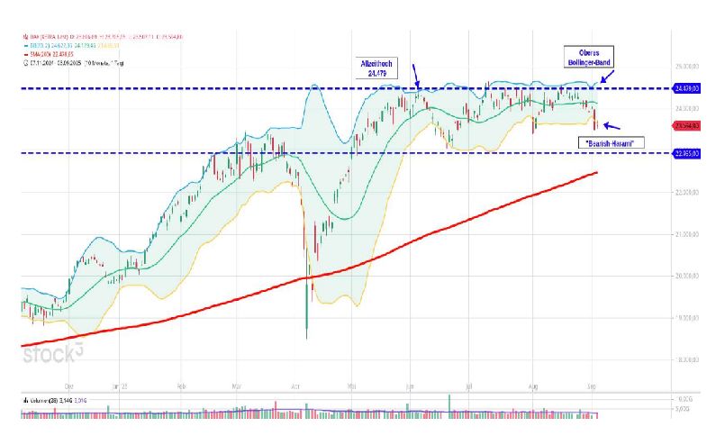 - Oberes Bollinger-Band: 24.622, Mittleres Bollinger-Band: 24.129, Unteres Bollinger-Band: 23.637