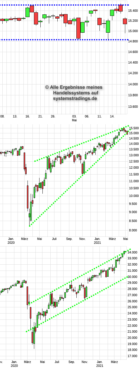 Die Schwäche hatte der DAX gestern schon offenbart, entsprechend ist die Enttäuschung der Anleger gross und er macht sich auf den Weg nach unten. Man sieht welch Spannung und Drama dieser Seitwärtstrend bietet. Charts: DAX-Tageschart, DAX-Wochenchart, DOW-Wochenchart.
