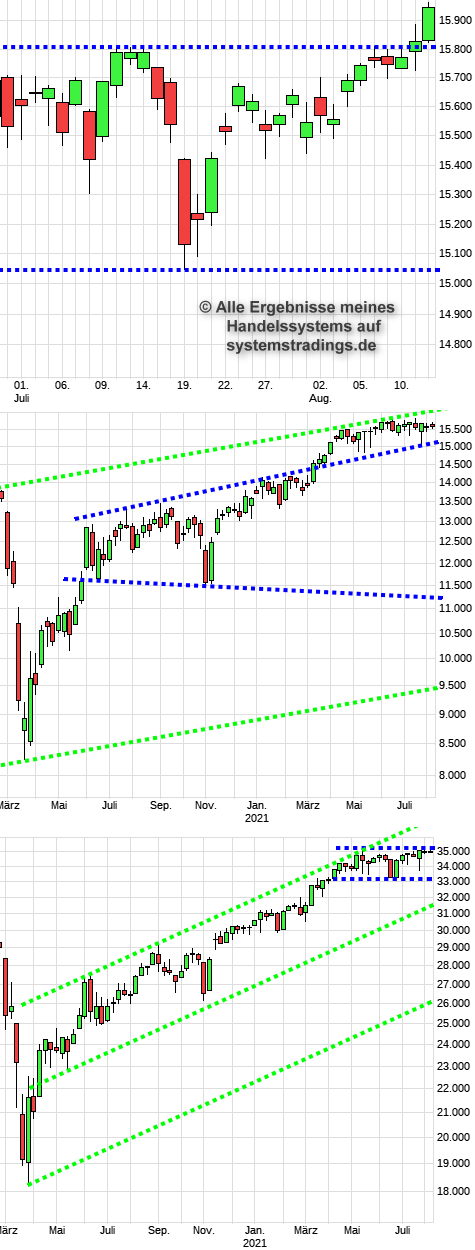 Es hat sich angekündigt und es ist passiert. Der DAX verlässt den monatelangen Seitwärtstrend. Ihm war es wohl selber zu langweilig geworden. Der Grund ist eher, der Verfallstag in einer Woche. Laut offenen Optionen, ist die Wahrscheinlichkeit gross, dass der DAX da über 16000 sein. Warum werden reiche Menschen immer reicher? Tatsächlich ist es so, dass das Geld immer zum Geld kommt. Wie machen es die Starinvestoren, die immer reicher werden? Welche Aktien halten sie? In welchen Bereich investieren sie die nächsten Jahre? Diese Frage beantworte ich jedem, der meine Signale erhält und zeige ihm, die Aktien die die reichsten Menschen halten und die sich alle paar Jahre verdoppeln. Nur nebenbei erwähnt, mein Handelssystem war vor dem Ausbruch long. Man hatte also wieder ein doppeltes Longsignal, charttechnisch und Handelssystem/Indikatoren. Charts: DAX-Tageschart, DAX-Wochenchart, DOW-Wochenchart.