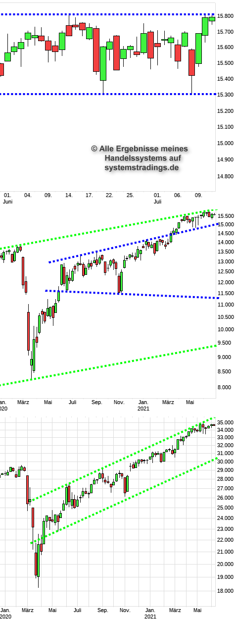 Ja man sieht der DAX testet den zweiten Tag die Trendlinie. Ideal wäre ein Ausbruch mit Gap, das würde die Mehrheit abschütteln. Wobei die letzten Tage die Shortpositionen gestiegen sind. Reicht das schon aus um ungehindert auf neue Hochs zu klettern? Ein Scheitern nach oben, offenbart wiederum eine Schwäche im Markt. Der Seitwärtstrend wurde unten getestet und bestätigt und jetzt erneut oben, was die Trendlinien als richtig eingezeichnet bestätigt. Charts: DAX-Tageschart, DAX-Wochenchart, DOW-Wochenchart.