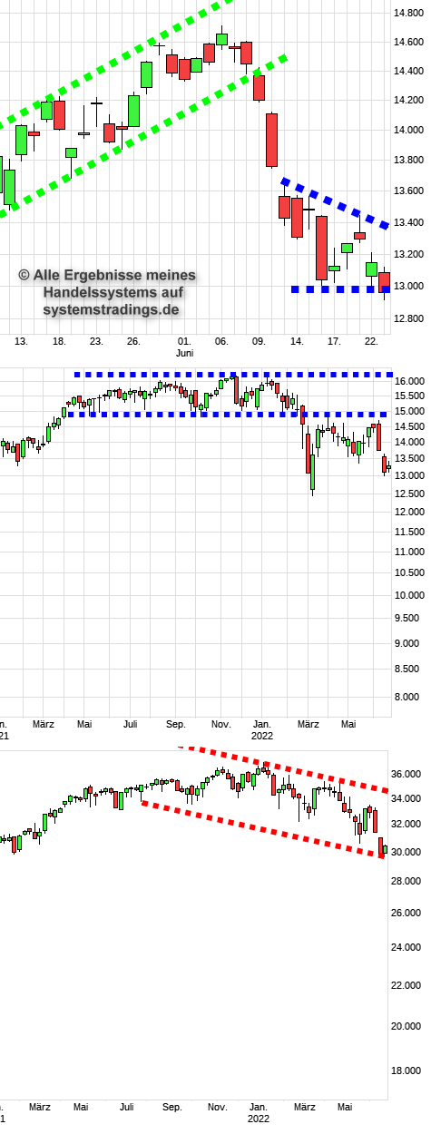 Die Schwäche im DAX ist unübersehbar. Er schafft es nicht mal, das Gap vom Vortag zu schliessen. Wie will er da die Gaps weiter oben schliessen? Erst über 13400 besteht wieder Hoffnung nach oben. Zur Zeit kämpft er um die 13000 die verteidigt werden muss. Charts: DAX-Tageschart, DAX-Wochenchart, DOW-Wochenchart.