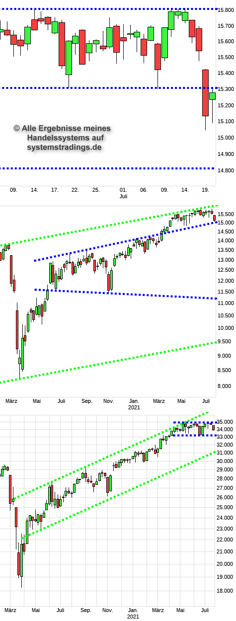 Der DAx hat gestern den Seitwärtstrend erweitert und befindet sich jetzt in einem breiteren Seitwärtstrend. Er reicht jetzt von 15800 bis 14800, also ganze 1000 Punkte. Der Bereich um die 15000, ist als psychologischer Widerstand zu sehen. Beim DOW wird es unter 33000 negativ, der DAX könnte dann an der unteren Trendlinie bei 14800 sein. Charts: DAX-Tageschart, DAX-Wochenchart, DOW-Wochenchart.
