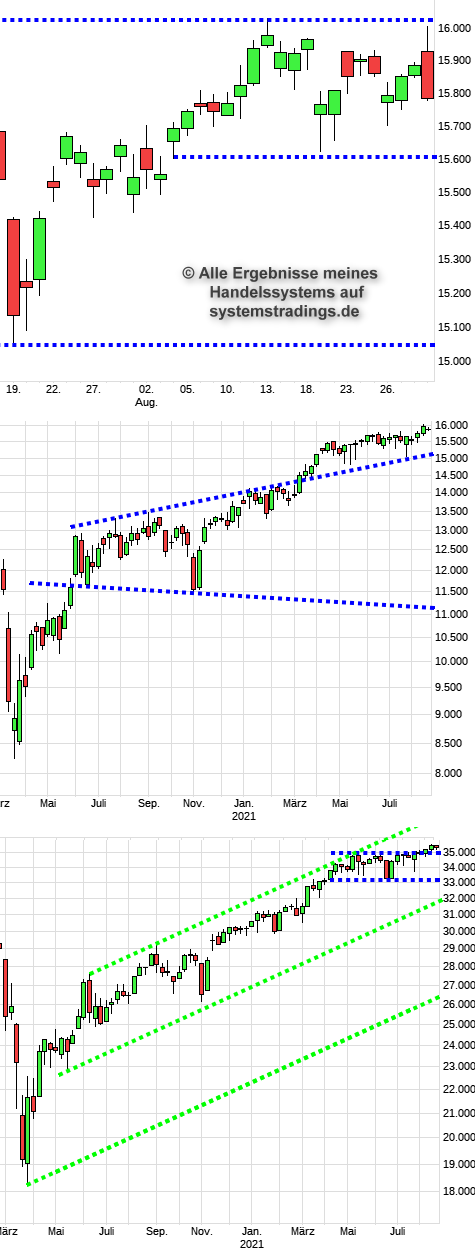 Der DAX erreichte heute punktgenau die obere Trendlinie bei 16000 und bestätigt den Seitwärtstrend oben. Man sieht, wie wichtig die Marke ist, da sich da viele positionieren und viele Verkaufsorder einstellen. Diese müssen erst alle aufgekauft werden, bevor er ausbrechen kann. Jetzt bleibt zu hoffen, dass die Anleger nicht zu enttäuscht sind und sich der DAX spätestens bei 15600 fangen kann. Wer auf einen Ausbruch im September hoffte, muss zunächst noch warten. Der Monat scheint dieses Jahr bei den Anlegern auch nicht besonders beliebt zu sein. Charts: DAX-Tageschart, DAX-Wochenchart, DOW-Wochenchart.