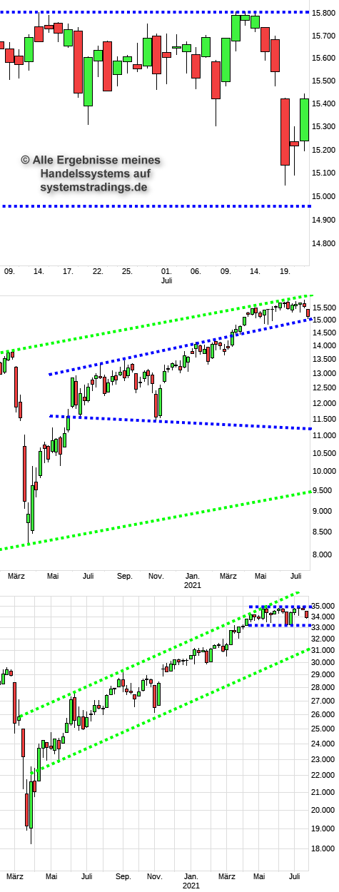 Der DAX ist auf dem Weg, das Gap zu schliessen. Man sieht den neuen breiteren Seitwärtstrend, der ganze 1000 Punkte breit ist. Beim DOW ist er fast 2000 breit, wichtig ist da weiter der Bereich von 33000. Charts: DAX-Tageschart, DAX-Wochenchart, DOW-Wochenchart.