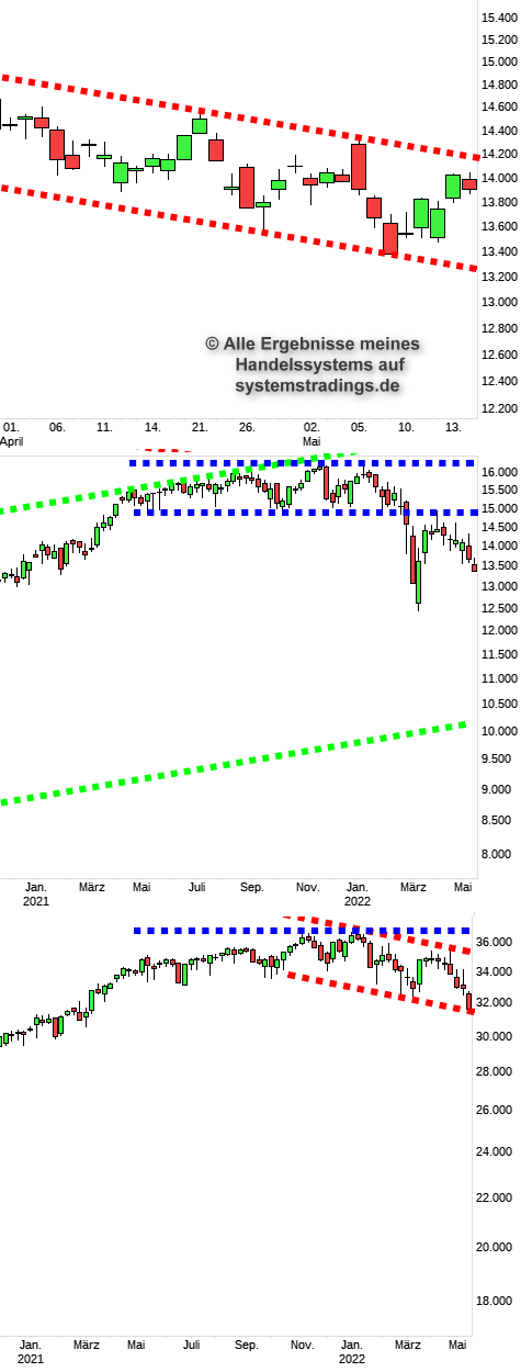 Noch bewegt sich alles in den Trendkanälen. Der DOW hat aber sehr viel Platz und kann den DAX mitziehen, dann sehen wir einen Ausbruch nach oben. Charts: DAX-Tageschart, DAX-Wochenchart, DOW-Wochenchart.