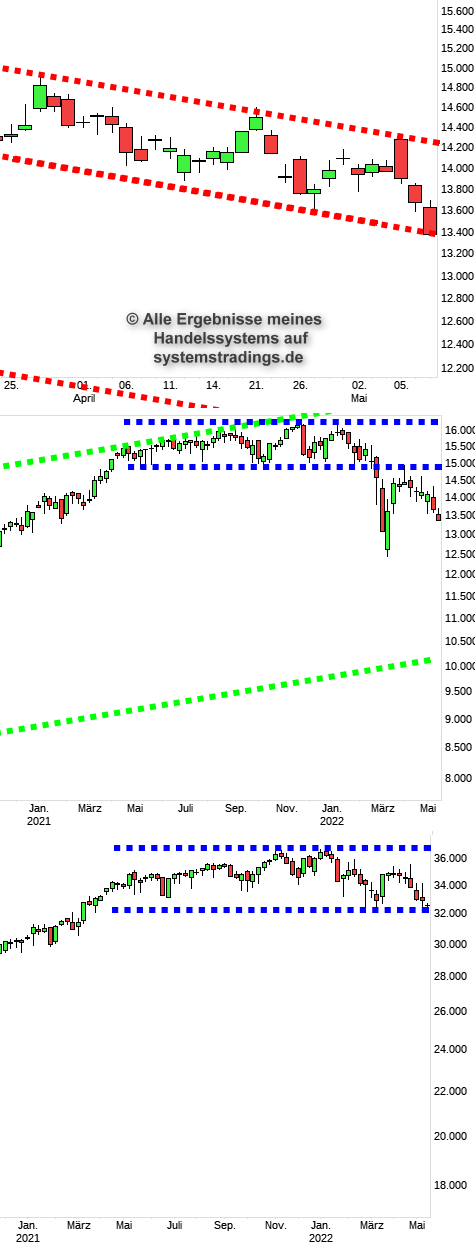 Mal oben, dann unten der DAX tobt sich nach Belieben im Trendkanal aus. Platz ist weiterhin viel um sich auszutoben und alle abzuschütteln, in beide Richtungen. Auch der DOW ist erneut in dem Unterstützungsbereich und macht es spannend. Charts: DAX-Tageschart, DAX-Wochenchart, DOW-Wochenchart.