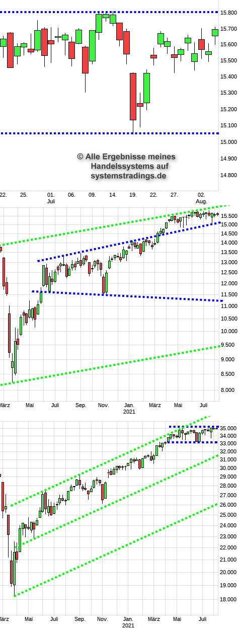 Der DAX macht sich auf, erneut die 15800 zu testen. Wenn der Ausbruch gelingt, ist der Weg nach oben natürlich frei. Nach 4 Monaten seitwärts, ist die Zeit langsam reif. Entsprechend muss der DOW dann auch die 35000 überwinden, er testete sie ja mehrmals. Charts: DAX-Tageschart, DAX-Wochenchart, DOW-Wochenchart.