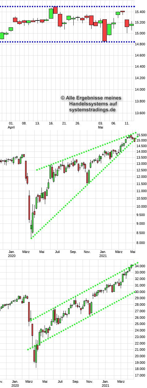 Der DAX tobt sich natürlich weiter aus mit den gewohnten täglichen Kurswechseln. Charttechnisch ist wieder Geduld gefragt, bis sich alle die Finger verbrannt haben und der DAX dann ausbrechen kann. Charts: DAX-Tageschart, DAX-Wochenchart, DOW-Wochenchart.