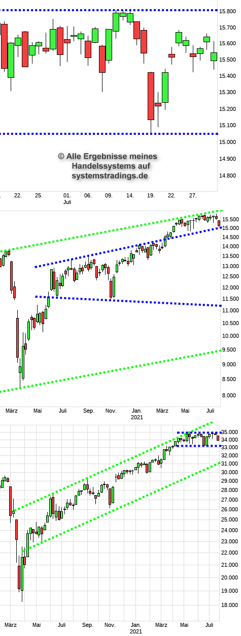 Die Frage ist, was tut der DAX die nächsten Monate? Statistisch sind die Monate August und September nicht die Besten. Ich erwarte ja eher im Herbst neue Hochs, aber was erwartet und denn dann bis dahin? Zwei Monate Seitwärts mit täglichen Richtungswechsel? Hoffen wir es nicht, sonst wird es zermürbend und langweilig. Charts: DAX-Tageschart, DAX-Wochenchart, DOW-Wochenchart.