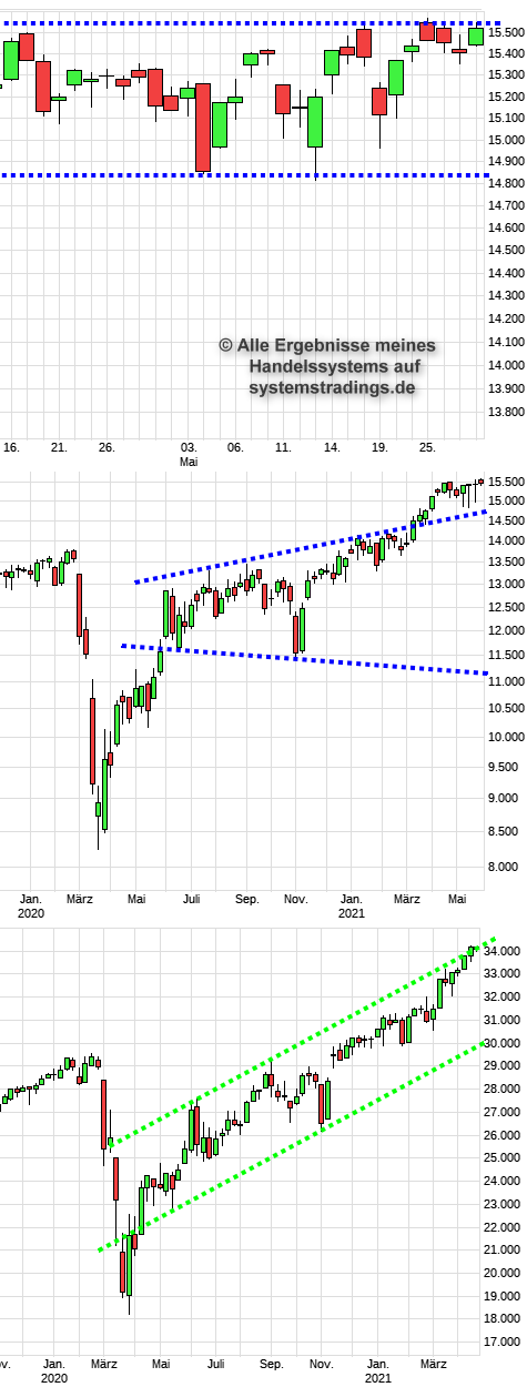 Der DAX angelt sich weiter oben entlang und bereitet einen Ausbruch vor. Gelingt er nach oben, ist der Weg für einen neuen Aufwärtstrend frei. Von der Dauer der Seitwärtsbewegung, ist die Zeit reif. Charts: DAX-Tageschart, DAX-Wochenchart, DOW-Wochenchart.