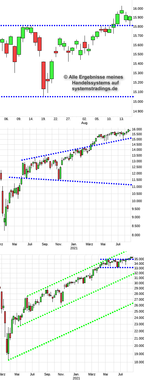Der DAX testet heute die Ausbruchstrendlinie und drehte da punktgenau. Jetzt muss er zeigen, dass er es mit dem Ausbruch ernst meint und nicht zurück fällt. Entsprechend muss auch der DOW die 35000 verteidigen. Charts: DAX-Tageschart, DAX-Wochenchart, DOW-Wochenchart.
