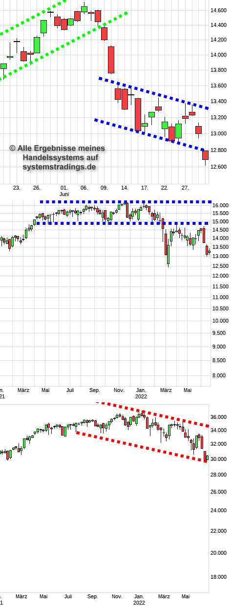 Die Enttäuschung der Anleger, dass er nicht nach oben ausgebrochen war, sieht man deutlich. Heute wurde der flache Abwärtstrend dann mit einem Gap nach unten verlassen. Man sieht, genau unter der Trendlinie eröffnete der DAX und schloss wie immer die Masse aus. Charts: DAX-Tageschart, DAX-Wochenchart, DOW-Wochenchart.