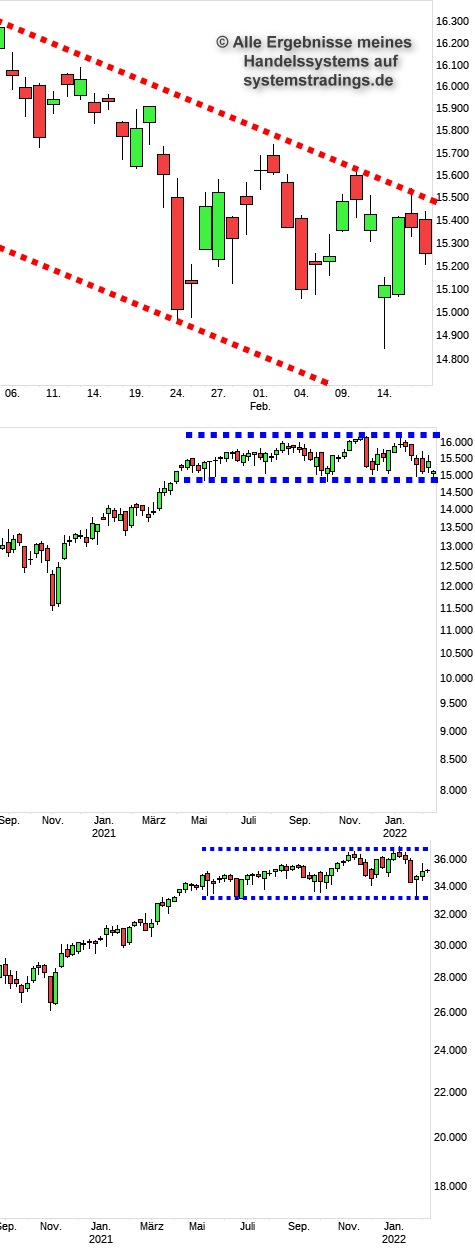 Der DAX bewegt sich weiter im Trendkanal und hat natürlich viel Platz um sich auszutoben. Charts: DAX-Tageschart, DAX-Wochenchart, DOW-Wochenchart.