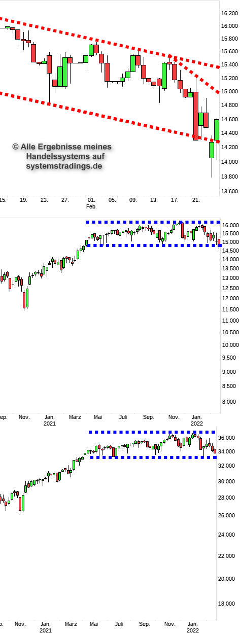Der DAX hat heute den Abwärtstrend zurückerobert und offenbart somit die Übertreibung nach unten. Platz ist jetzt bis 15000, darüber bis 15400. Erst darüber ist die Gefahr vor neuen Tiefs gebannt. Charts: DAX-Tageschart, DAX-Wochenchart, DOW-Wochenchart.