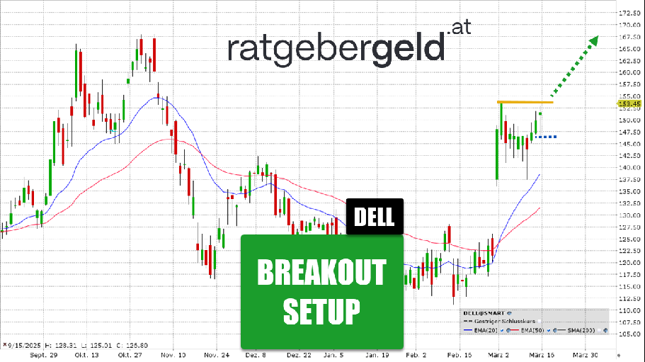 Steigt die Aktie kurz über 153,75 US-Dollar, fällt aber am selben Tag wieder zurück, hätten wir es mit einem Fehlausbruch zu tun. Wenn die letzten beiden Tageskerzen unterschritten werden, wäre dies das nächste Warnsignal. Fällt Dell unter den EMA 20, würde sich das Momentum massiv eintrüben. Das nächste Ziel wäre dann der GAP-Close im Bereich um 125 US-Dollar.