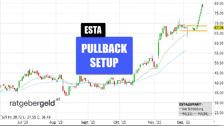 Rückblick: Nach den recht positiven Ergebnissen des dritten Quartals 2025 reagierte die Esta-Labs-Aktie mit einem kräftigen Kurssprung nach oben und hielt sich im Anschluss mit Schlusskursen über dem 20er-EMA. Mit der gestrigen Washout-Kerze wurde die grüne Linie nur intraday getestet. Das Halbjahresplus beträgt circa 76 Prozent.