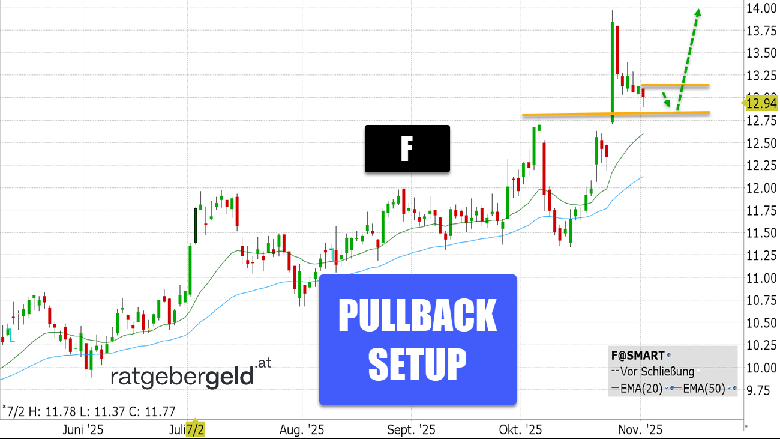 Rückblick: Während die Wertpapiere europäischer Automobilbauer gerade schwächeln, zeigt die Ford-Aktie mit einem Halbjahresplus von circa 26 Prozent in einem Aufwärtstrend eine starke Performance. Das Gap Up nach den Q3-Zahlen und der anschließende Rücksetzer komplettieren das Long Setup.