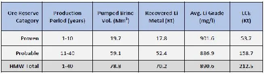 Für die Phase 1 DFS wurden aus der HMW-Ressource mit dem Nachweis der wirtschaftlichen Förderbarkeit erste Reserven mit geschätzten 212 kt erzielbarem LCE gebildet. Diese Reserven basieren allerdings nur auf der Phase 1. Für die angestrebte Phase 2 DFS wird ein deutliches Anwachsen der HMW-Reserven erwartet, in der sich die Produktion auf 20 ktpa LCE in etwa vervierfachen soll.