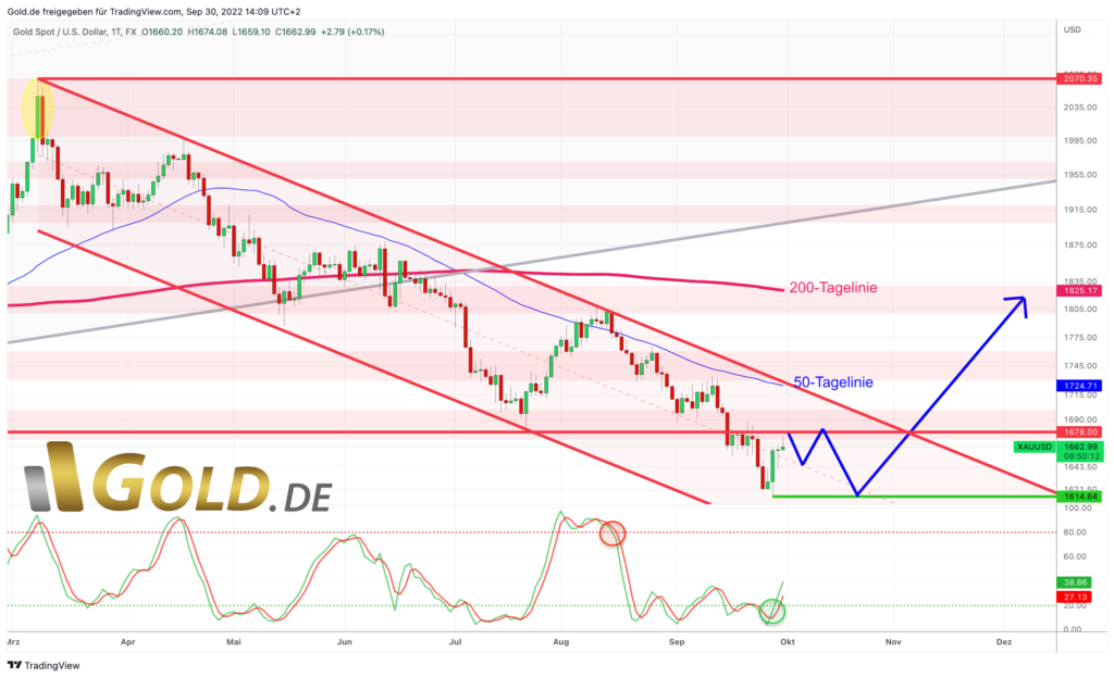 Auf die Kapitulation der britischen Notenbank hat der Goldpreis in den letzten zwei Tagen standesgemäß sofort und scharf reagiert. So konnten sich die Notierungen kurz vor dem Wochenende zwischenzeitlich bis auf fast 1.675 doch recht deutlich erholen. Unsere immer wieder geäußerte Vermutung, dass der Goldpreis als allererster auf einen Kurswechsel der Notenbanker antworten wird, hat sich also bewahrheitet. Trotzdem kann noch keine endgültige Entwarnung gegeben werden. Je nachdem wie lange insbesondere die US-Notenbanker das vermeintliche Einknicken bzw. die Kehrtwende in der Geldpolitik hinauszögern, kann die Lage am Goldmarkt ungemütlich bleiben oder sich sogar mit neuen Tiefs nochmals verschärfen.