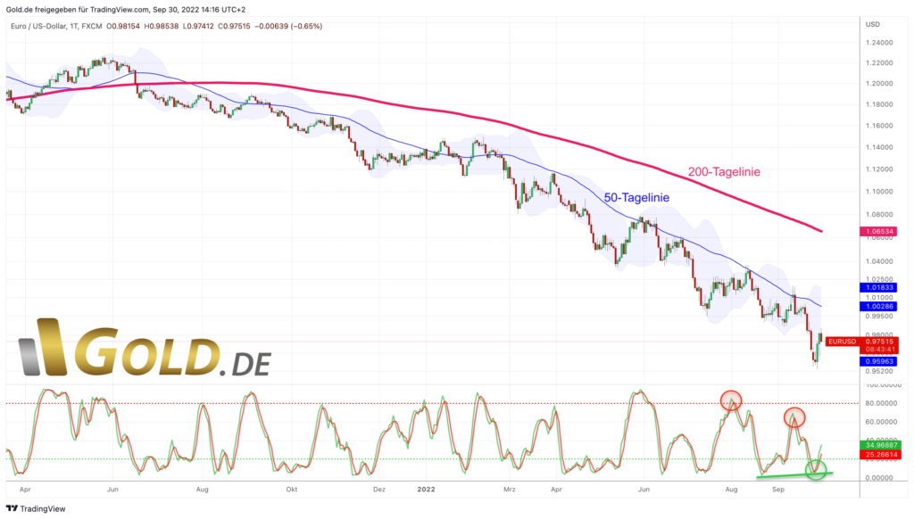 Außer einer ersten Gegenbewegung von 0,9532 auf 0,9853 USD ist beim Euro/US-Dollar bislang aber nichts nachhaltigeres zu beobachten gewesen. Ein neues Tief unter 0,9532 USD, gepaart mit negativen Divergenzen bei den Indikatoren würde die Wahrscheinlichkeit für ein vorübergehendes Ende der Dollarstärke jedenfalls deutlich erhöhen. Wir vermuten, dass genau das im Laufe des Oktobers passieren wird.