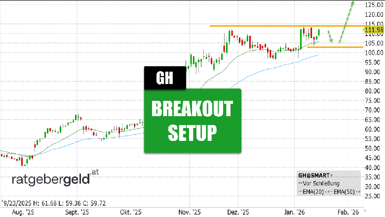 Guardant-Health–Aktie: Chart vom 15.01.2026, Kürzel: GH Kurs: 111.98 USD, Tageschart Quelle: TWS