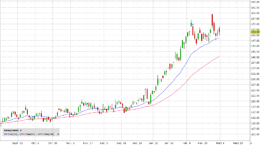 Der Hauptgrund für den Sprung von 120 auf fast 160 US-Dollar ist die geopolitische Krise. Da eine Sperrung der Straße von Hormus bis Ende März mit hoher Wahrscheinlichkeit eingepreist wird, wetten Anleger auf dauerhaft hohe Ölpreise über 90-100 US-Dollar. Der Chart zeigt eine beeindruckende Rallye, die sich seit Anfang Januar massiv beschleunigt hat. Nach einem neuen Allzeithoch bei 159,61 US-Dollar am 2. März sehen wir aktuell eine gesunde Konsolidierung. Exxon ist heute keine reine Öl-Wette mehr, sondern eine hocheffiziente „Cash-Maschine“ mit massiven Rückzahlungen an die Aktionäre.