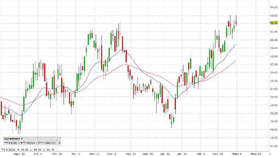 EQT ist der größte reine Erdgasproduzent in den USA. Der massive Ausbau von KI-Rechenzentren treibt den Strombedarf in den USA in ungeahnte Höhen. Da Wind und Sonne die Grundlast oft nicht decken können, wird Erdgas als Brückentechnologie unverzichtbar. Die Aktie profitiert direkt vom KI-Hype und der Energiewende-Infrastruktur. Die Aktie befindet sich in einem extrem kraftvollen und steilen Aufwärtstrend. Der Abstand zur 20-Tagelinie ist beachtlich. Das zeigt ein hohes kurzfristiges Momentum, birgt aber auch das Risiko einer kurzfristigen Überhitzung.