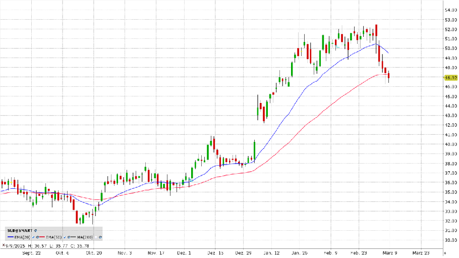 Abschließend werfen wir einen Blick auf Schlumberger (SLB), den weltweit führenden Technologiedienstleister für die Öl- und Gasindustrie. Während Firmen wie Exxon das Öl fördern, liefert SLB das „Gehirn“ und das Werkzeug dafür. SLB ist der Architekt, der Statiker, der Vermessungstechniker und derjenige, der die modernsten Smart-Home-Systeme installiert. Ohne SLB findet heute kaum noch eine effiziente Bohrung statt. Charttechnisch zeigt SLB aktuell ein deutlich schwaches Bild. Der EMA 50 bietet aktuell keinen Halt mehr, was charttechnisch ein kurzfristiges Verkaufssignal darstellt. Der nächste größere Halt liegt erst wieder im Bereich von 42 US-Dollar.