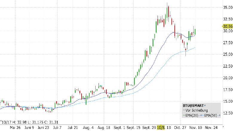 Peabody Energy – früher als Peabody Coal Company bekannt – ist der größte privatwirtschaftliche Kohleförderer weltweit und hat seinen Hauptsitz in St. Louis, Missouri. Das Unternehmen baut sowohl Kraftwerks- als auch Kokskohle ab. Im April 2016 musste Peabody Insolvenz nach Chapter 11 des US-Insolvenzrechts anmelden. Dabei wurde bekannt, dass der Konzern aktiv an der organisierten Leugnung des Klimawandels beteiligt war. Nach einem Rekordjahr 2022 sind die Geschäftszahlen inzwischen rückläufig, und für das laufende Jahr rechnet man mit einem Verlust. Der Aktienkurs zeigt jedoch im bisherigen Jahresverlauf ein Plus von rund 105 Prozent, gefolgt von einer Korrektur nach dem jüngsten Pivot-Hoch und einer anschließenden Stabilisierung über den gleitenden Durchschnitten.