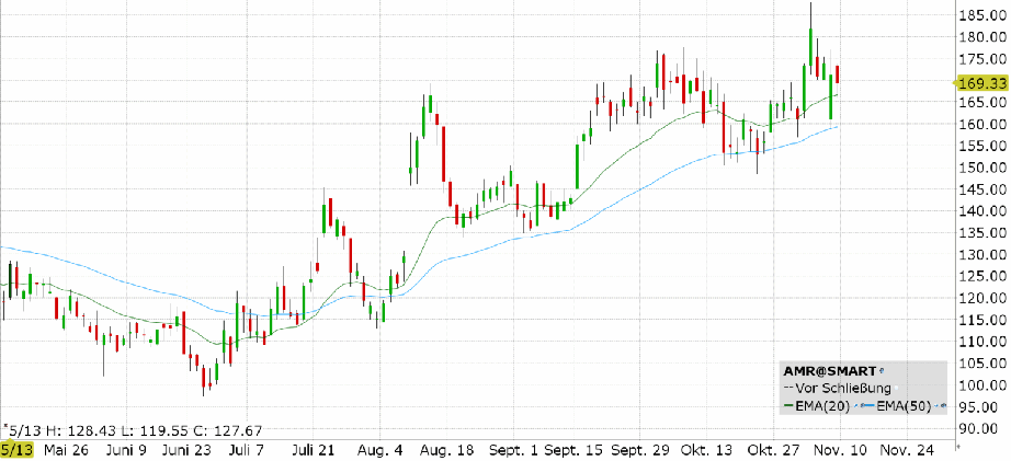Alpha Metallurgical Resources mit Sitz in Tennessee betreibt Bergwerke in Virginia und West Virginia. Das Unternehmen beliefert Stahlhersteller weltweit mit hochwertigen metallurgischen Kohleprodukten. Dank umfangreicher Lagerstätten und hervorragender Hafenanbindung garantiert Alpha eine verlässliche Versorgung der Stahlindustrie. 2024 gab es auch hier Verluste. Die Kursentwicklung mit einem Plus von rund 45 Prozent in den vergangenen sechs Monaten mit einer Orientierung an den gleitenden Durchschnitten ist jedoch gleichfalls positiv.