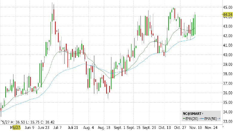 NACCO Industries ist eine US-amerikanische Holding, deren Kernbeteiligung der Kohleförderer North American Coal (NACoal) ist. Bis in die 2010er Jahre agierte das Unternehmen als breit diversifizierter Mischkonzern. In den letzten Jahren schwankten die Ergebnisse stark: Aktuell zeigen die Quartalszahlen zwar Umsatzwachstum, der Gewinn liegt jedoch unter dem Vorjahresniveau. Die Aktie legte in den vergangenen sechs Monaten rund 30 Prozent zu. Spannend wird es bei 45 USD, wo eine Widerstandslinie den Kursanstieg zu