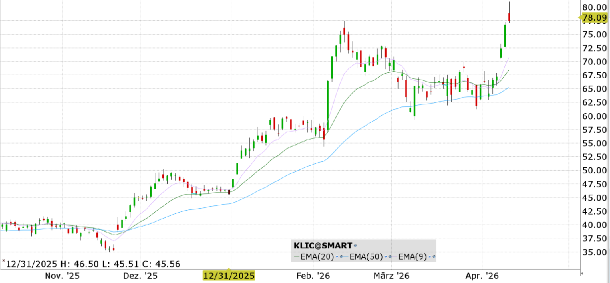 Kulicke and Soffa,1951 gegründet, ist in Singapur registriert, mit operativen Hauptsitzen in Fort Washington, Pennsylvania. Das Unternehmen entwickelt und produziert Ausrüstung und Werkzeuge für die Halbleiter- und LED-Industrie, insbesondere Drahtbondmaschinen und Advanced Packaging-Lösungen. K&S hat kürzlich das Asterion-TW Ultraschallsystem für Leistungsbaugruppen und neue Speicherlösungen auf den Markt gebracht. Umsatz und Gewinn lagen zuletzt deutlich über den Erwartungen. Auch das Halbjahresplus von 95 Prozent im Chartbild ist sehr überzeugend. Die Entfernung vom 50er-EMA und die letzte Tageskerze deuten aber kurzfristig eher auf rückläufige Kurse hin.