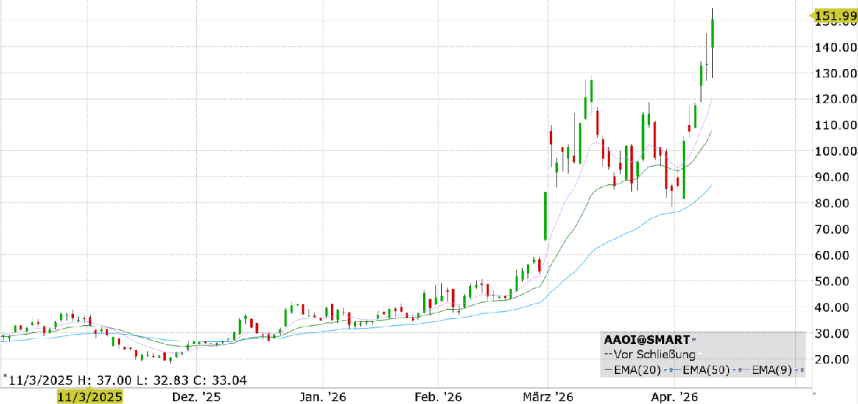 Applied Optoelectronics hat seinen Sitz in Sugar Land, Texas, und besteht seit 1997. Das Unternehmen ist spezialisiert auf die Entwicklung und Herstellung von faseroptischen Produkten, insbesondere Transceiver und Laser für Rechenzentren, Telekommunikation und CATV-Netzwerke. Die fundamentalen Zahlen liegen trotz aktueller Erfolgsmeldungen zu Großaufträgen im roten Bereich. Die Chartentwicklung mit einem Plus von 426 Prozent in sechs Monaten sieht aber extrem gut aus.