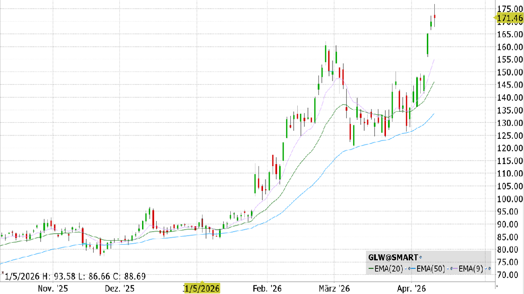 Corning blickt auf eine über 170-jährige Geschichte zurück – das Unternehmen entstand 1851 und hat seinen Hauptsitz in Corning, New York. Das Unternehmen ist führend in der Spezialglas-, Keramik- und optischen Physik-Technologie, bekannt für Produkte wie Gorilla Glass für Smartphones, optische Fasern, Display-Technologien und Keramiksubstrate für Automobilkatalysatoren. Sowohl die fundamentalen Eckwerte für 2025 mit einem Umsatzplus von 19 und einem Gewinnwachstum von über 215 Prozent sowie der Kursverdoppler im Chartbild der vergangenen sechs Monate sind sehr überzeugend.