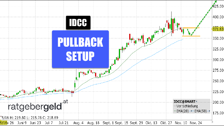 Rückblick: Ein Kursplus von rund 71 Prozent in einem intakten Aufwärtstrend, ein Rücksetzer vom Allzeithoch zum 20er-EMA mit darüberliegenden Schlusskurs und eine starke grüne Kerze am gestrigen Dienstag sind starke Argumente für die Bullen im Chartbild der InterDigital-Aktie.
