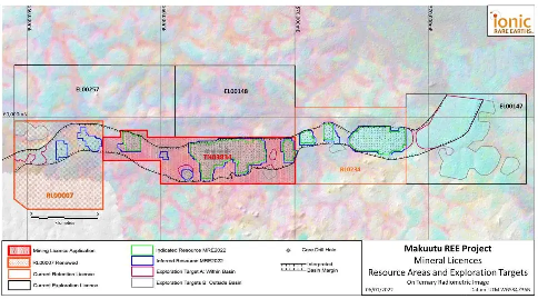 IonicRE hatte erst kürzlich Fortschritte von seiner Versuchsanlage auf "Makuutu" sowie vom aktuellen und weiterhin plangemäß verlaufenden Phase-5-Bohrprogramm gemeldet, bei dem zurzeit 1.618 Bohrmeter in 79 Löchern abgeschlossen sind. Ziel des Programms ist die Verbesserung der Zuverlässigkeit der bestehenden Mineralressourcenschätzung auf der Lizenz "RL00007" (links unten in der Grafik).