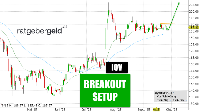 Rückblick: Wir fokussieren uns auf die Entwicklung nach den Q2-Zahlen im Chartbild der Iqvia-Aktie. Das Wertpapier reagierte bei hohem Handelsvolumen mit einem recht großen Kurssprung auf das solide Zahlenwerk. Der anschließende Rücksetzer orientierte sich eng am 20er-EMA. Zuletzt verengte sich die Kursspanne in eine schlanke Seitwärtsrange. Der aktuelle Kurs notiert weit über der aufgerissene Kurslücke, sodass diese sehr wahrscheinlich nicht so bald wieder geschlossen wird.