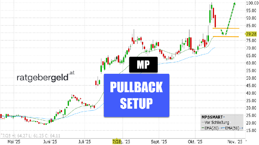 Rückblick: Das gesteigerte Interesse der Anleger an Seltenen Erden zeigt sich unter anderem an der Kursentwicklung der MP-Materials-Aktie. Das Wertpapier überzeugt mit einem Halbjahresplus von rund 222 Prozent. Ausschlaggebend ist die Schlüsselrolle dieser Materialien für Energiewirtschaft und Mobilität. Derzeit dominiert China die Branche und reagiert mit Exportbeschränkungen als Retourkutsche auf die Handelsbeschränkungen der US-Administration. Nach dem Rücksetzer vom Allzeithoch schwebt die Aktie vorbörslich zwischen dem gestrigen Schlusskurs und dem 20er-EMA.