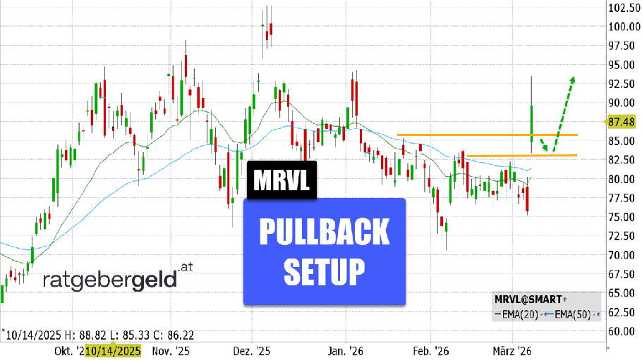 Der Chipkonzern Marvell Technology sorgte mit seinen Quartalszahlen für eine äußerst positive Marktreaktion. Im 4. Quartal des Geschäftsjahres 2026 übertraf das Unternehmen die Erwartungen der Analysten leicht und meldete einen bereinigten Gewinn je Aktie von 0.80 USD nach 0.60 USD im Vorjahresquartal. Der Umsatz stieg auf 2.219 Mrd. USD und lag damit ebenfalls über den Prognosen. Treiber der starken Entwicklung ist vor allem die hohe Nachfrage von Cloud-Unternehmen wie Alphabet, Amazon, Meta und Microsoft nach ASICs (application-specific integrated circuits = maßgeschneiderten Chips für Rechenzentren und KI-Infrastruktur). Auch der Nettogewinn auf GAAP-Basis verbesserte sich deutlich auf 396.1 Mio. USD beziehungsweise 0.46 USD je Aktie, während der bereinigte Gewinn 685.1 Mio. USD erreichte. Für das 1. Quartal des laufenden Geschäftsjahres soll es laut dem aktuellen Ausblick einen Umsatz von rund 2.400 Mrd. USD geben. Beim Gewinn je Aktie rechnet das Unternehmen nach GAAP-Standard mit etwa 0.31 USD je Anteilsschein. Auf bereinigter Basis (non-GAAP) erwartet Marvell dagegen ein EPS von ungefähr 0.79 USD je Aktie – ein ordentlich Plus gegenüber den 0.62 USD im Vergleichsquartal des Vorjahres. In den genannten Prognosen sind – einschließlich üblicher Schwankungsbreiten – die inzwischen abgeschlossenen Übernahmen von Celestial AI und XConn Technologies bereits berücksichtigt. Noch prickelnder der längerfristige Ausblick: Der Halbleiterspezialist rechnet in den kommenden Jahren mit einem kräftigen Wachstumsschub. Bis zum Geschäftsjahr 2028 sollen die Erlöse auf etwa 15 Milliarden USD klettern. Das entspräche einem Plus von rund 40 Prozent und würde die derzeitigen Analystenprognosen von etwa 12.9 Milliarden USD klar übertreffen. Schon für 2027 stellt das Unternehmen einen Umsatzsprung von über 30 Prozent in Aussicht und erwartet Einnahmen von nahezu 11 Milliarden USD.
