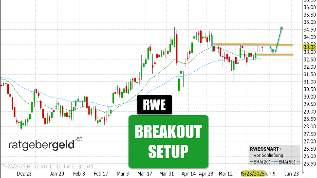 Beim Überschreiten der Widerstandslinie bei 33.50 EUR würden wir ein klares Kaufsignal im Chartbild der RWE-Aktie erkennen. Das Halbjahresplus liegt bei etwas über 8 Prozent.