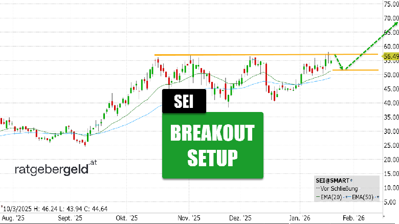Rückblick: Etwas oberhalb von 57 USD sehen wir eine markante Widerstandslinie mit zahlreichen Kontaktpunkten bei der Solaris-Energy-Infastructure-Aktie! Das Wertpapier steht in der Nähe des Allzeithochs und hat im vergangenen Halbjahr knapp 58 Prozent zugelegt. Der Aufwärtstrend ist auf der Oberseite nicht 100-prozentig perfekt, es sieht aber rundum bullisch aus.