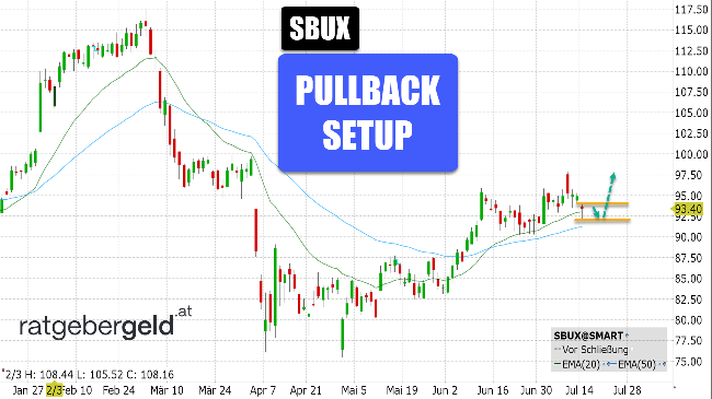 Stifel: Kursziel 109 USD!Rücksetzer zum 20er-EMA und Umkehrkerze bei Starbucks-Aktie (SBUX) nach Nullnummer im Halbjahresvergeich!